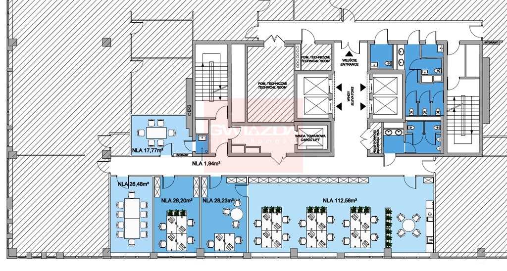 Koszt najmu 14,25 Euro/mkw., eksploatacja 27 zł/mkw., powierzchnia wspólna 7 %.