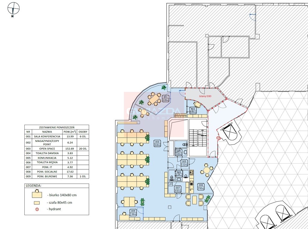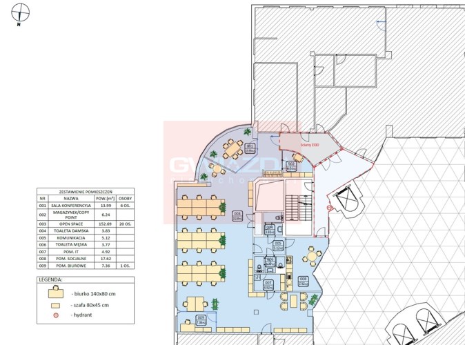 Standard powierzchni biurowej: klimatyzacja, wykładzina, podwieszane sufity, ścianki działowe.