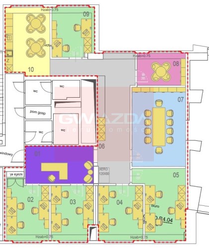 Standard powierzchni biurowej: klimatyzacja, pełne okablowanie, dwie linie zasilania, światłowód, czujniki dymu, ścianki działowe, wykładzina, kontrola dostępu, recepcja, otwierane okna, ochrona.