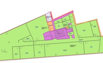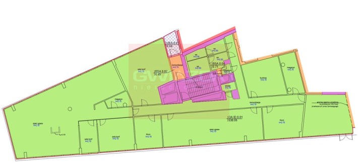 Powierzchnia biurowa na parterze o wielkości 496 mkw. netto, 540 brutto jest w znacznej części w układzie typu open space oraz kilka wydzielonych pomieszczeń biurowych w formie większych gabinetów.